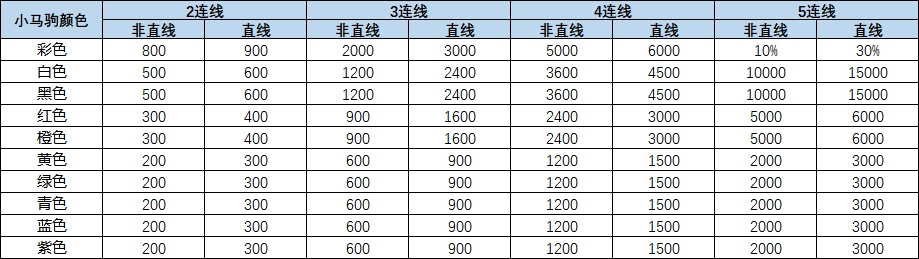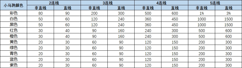 3、当玩家在普通投币时,出现彩色小马驹5连线【非直线】时,获得奖池1%的小马驹,出现彩色小马驹5连线【直线】时,获得奖池3%的小马驹。